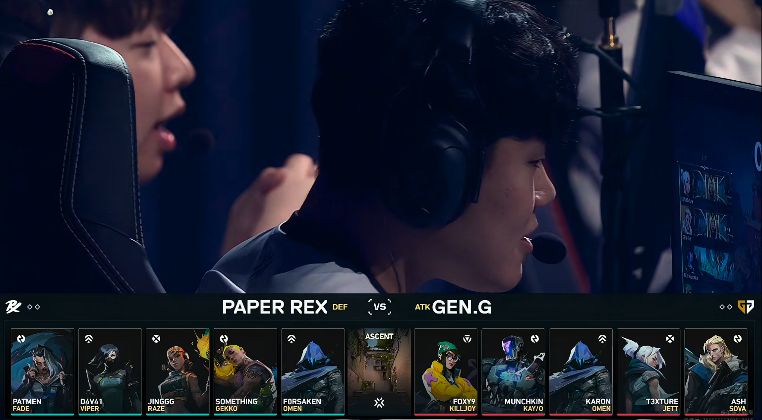 上半场GEN赢下手枪局,PRX奖励分轻松拿下。第4回合PRX在B点骗出道具后直接转A,但Munchkin在点内一人成军连打五人拿到ACE。第7回合t3冥驹被逮捕,PRX铺开技能提速进A,GEN回防交出奇乐大招与蝰蛇大招,在毒雾里强拆拿下。GEN连拿四分,第8回合PRX打A抓到GEN四人,PatMen蝰蛇开大覆盖包点,t3选择保狙,PRX拿到第2分。GEN打出一波三连胜,上半场GEN 9-3 PRX。