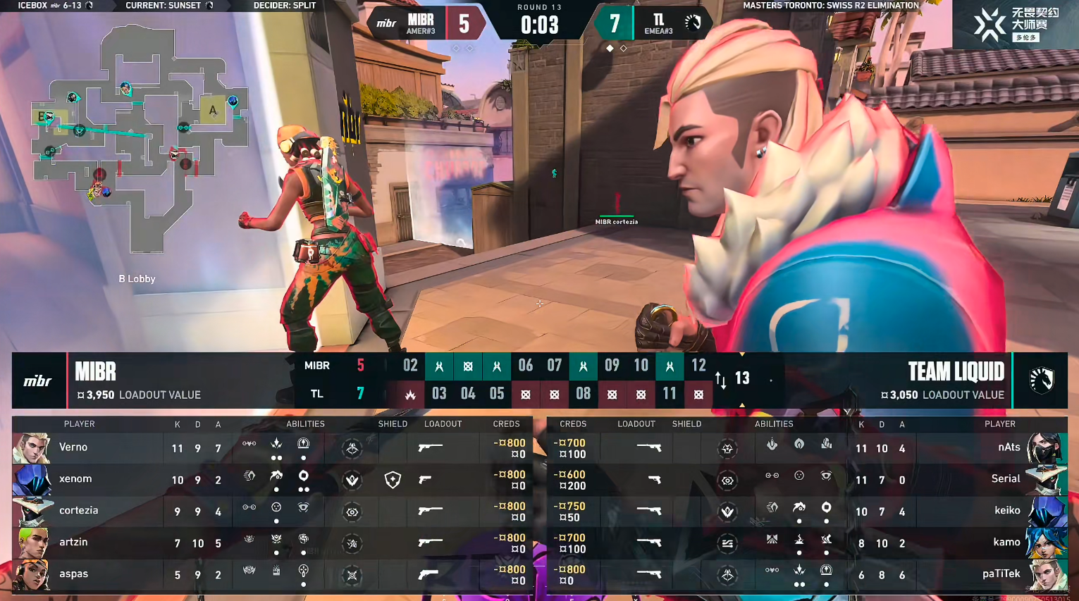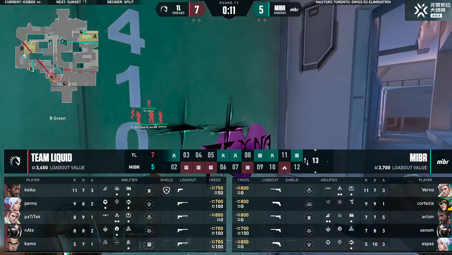 上半场TL赢下手枪局,MIBR在奖励局抱团推进连拿三分。第6回合TL守住厨房,回防B点拿下。两队紧咬比分经济都不是很好,第9回合MIBR打B在点内主动对枪,Keiko英雄狂徒一波三杀,帮助队伍完成存钱分的翻盘。第12回合TL在中路抓到MIBR的进攻路线,打出完美团灭,上半场TL 7-5 MIBR。