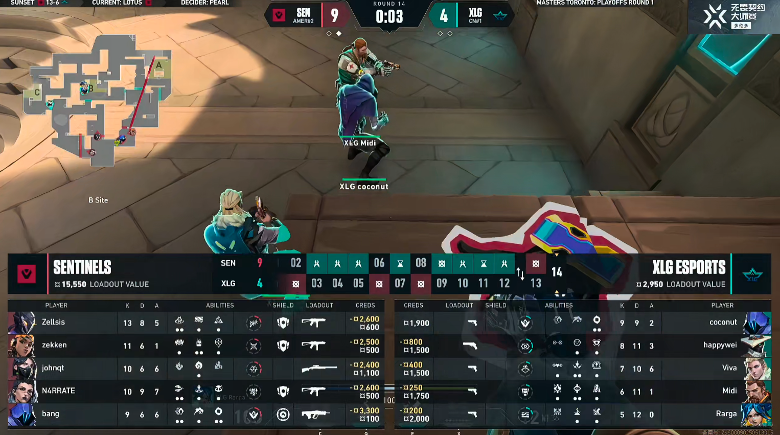 下半场SEN继续连胜,并赢下手枪局。第16回合XLG五人回防A点,一波五大三被SEN给拆分,bang最后残局六发子弹打掉两人。XLG赢下奖励局后没能稳住。第18回合XLG回防A点,在johnqt的大招毒雾中将其打掉,Rarga与coconut两人残局二打一赢下。第19回合SEN快攻C点,一波点内的交战XLG就剩一人,Viva面对四条枪线没有操作的机会,最终SEN 13-6赢下莲华古城。