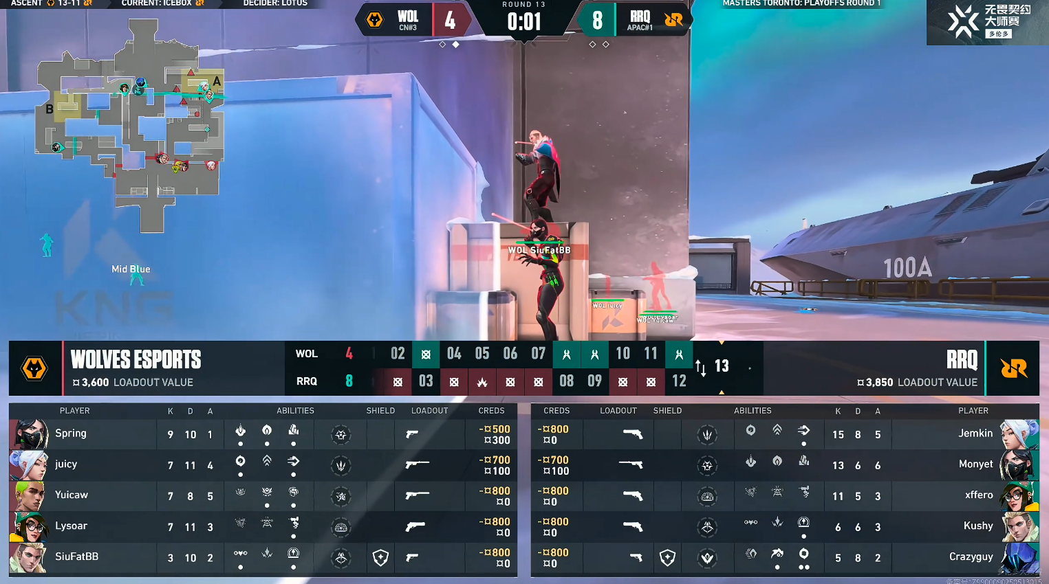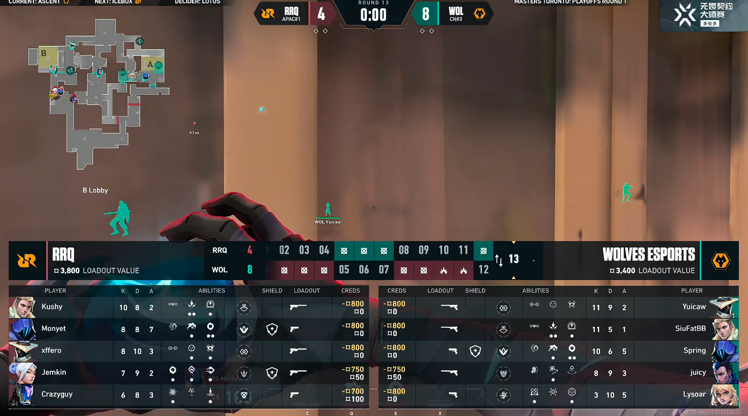 上半场狼队赢下手枪局,第3回合Yuicaw打B拿到四杀,Spring中路夹击补枪,狼队拿下RRQ的奖励分。狼队开局打出一波四连胜,RRQ用出暂停,在第5回合RRQ守住B点,中路与点内合力夹击防守,将狼队堵在B入口全部打掉,RRQ拿到首分。经过暂停调整RRQ逐渐适应比赛节奏找回状态,并连追三分。
