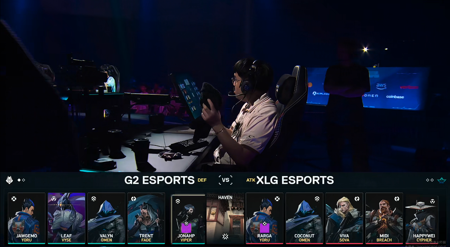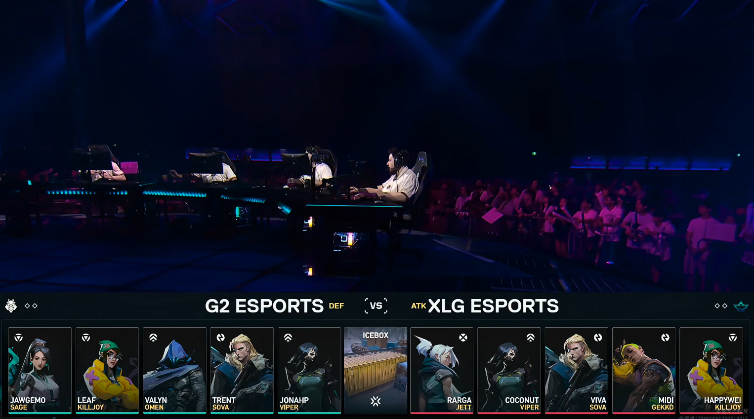 上半场G2赢下手枪局,第3回合XLG奖励局打A险胜。第4回合长枪对决,G2回防B点,JAWGEMO贤者给到冰墙限制了XLG的守包架枪,最后G2前后夹击清空黄箱赢下。第8回合XLG慢打B点,coconut蝰蛇开大覆盖包点,但又是JAWGEMO贤者冰墙隔断爆能器,将XLG的守包节奏打乱,G2轻松拿下这分。上半场最后一个回合XLG打A终于结束连败赢下,G2上半场打出8连胜拿到10分,而XLG只拿到两分。