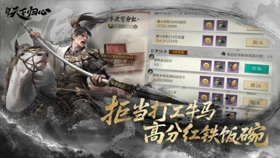 打破传统垄断,共享国家分红!让平民玩家也能端上铁饭碗!玩家无需依附强盟,参与国战、城战、建设即可坐享高频率分红,化身三国最强“合伙人”,不再无效劳动,真正实现多劳多得。到点收元宝,躺平也有收益,让你既能征战沙场建功业,也能偷得浮生半日闲。