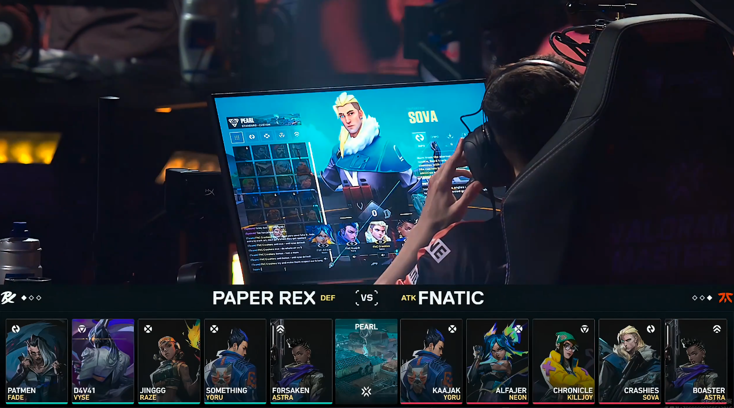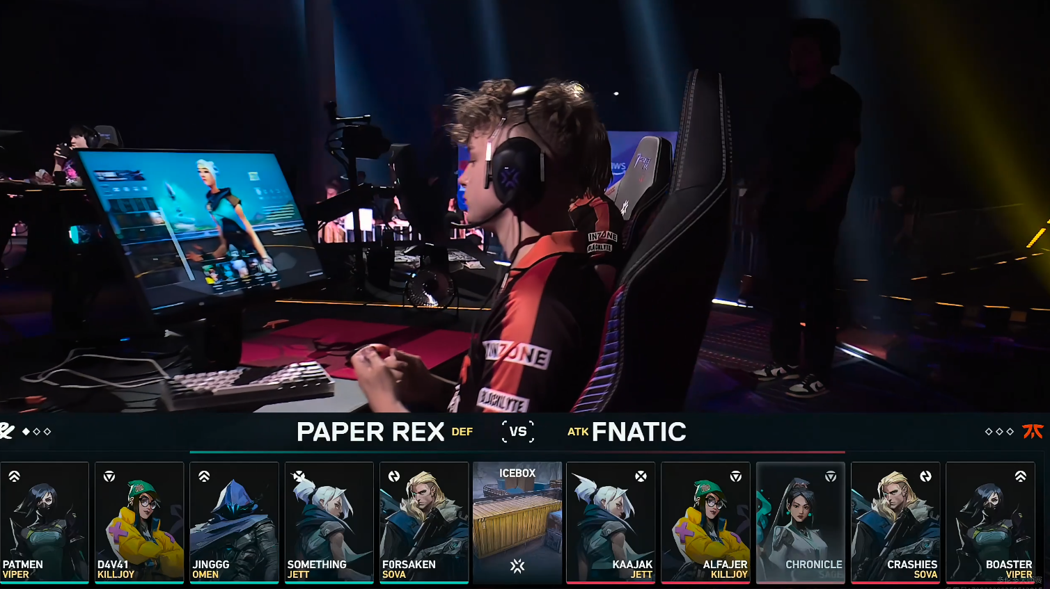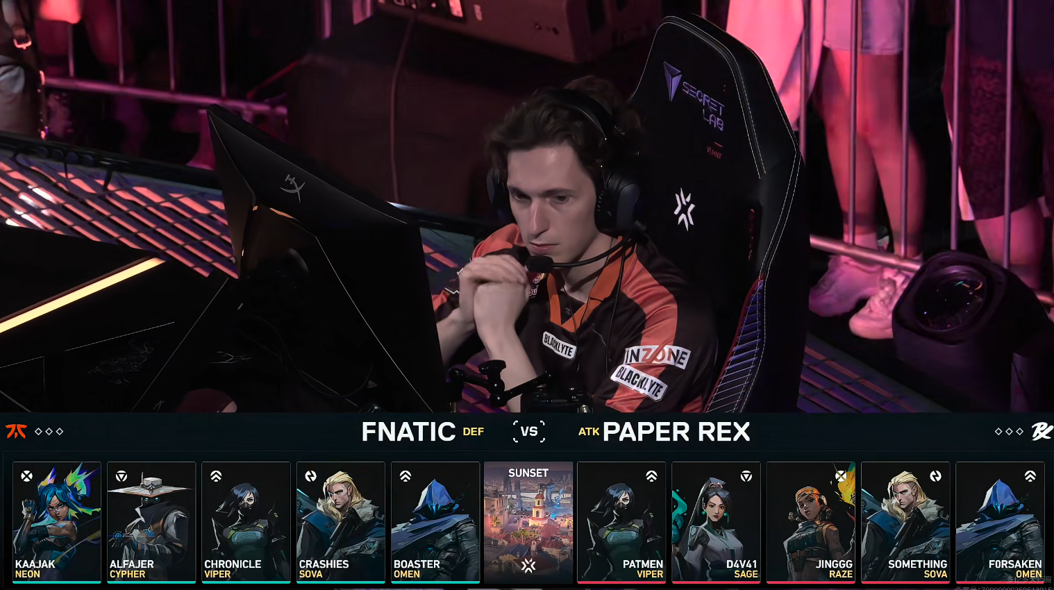 下半场FNC赢下手枪局打出四连胜,第17回合PRX打B艰难下包,FNC回防四打二被PRX给逆转,PRX拿到首分。第19回合kaajak的冥驹在A点给到PRX巨大的压力,kaajak打掉两个,与队友一同回防打赢拿到赛点。PRX面对拿到赛点的FNC,依然没有放弃,PRX连追四分,在第24回合PRX打A下包,并顶住FNC的回防赢下,PRX连追五分将比赛打到加时。