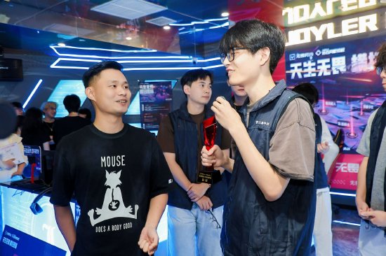 从视频走进现实,张全蛋亲临决赛现场为工友们助威。 这位常在网络内容中以幽默方式呈现“富士康经历”的知名红人,首次与真正的富士康工友面对面,为两支闯入决赛的队伍加油打气。“本想单为富士康加油,没想到决赛成了富士康‘内战’,太牛了!”他笑着感慨。赛前,张全蛋为双方鼓劲,队员们也以充满工厂特色的幽默狠话点燃现场。比赛中,“来财”战队展现统治级实力,直落两局锁定胜局。这支以质朴愿望命名的队伍,最终捧起了象征荣耀的冠军奖杯。赛后,张全蛋不仅为冠军颁奖合影,更化身临时记者,与“来财”队员们畅聊夺冠心得。