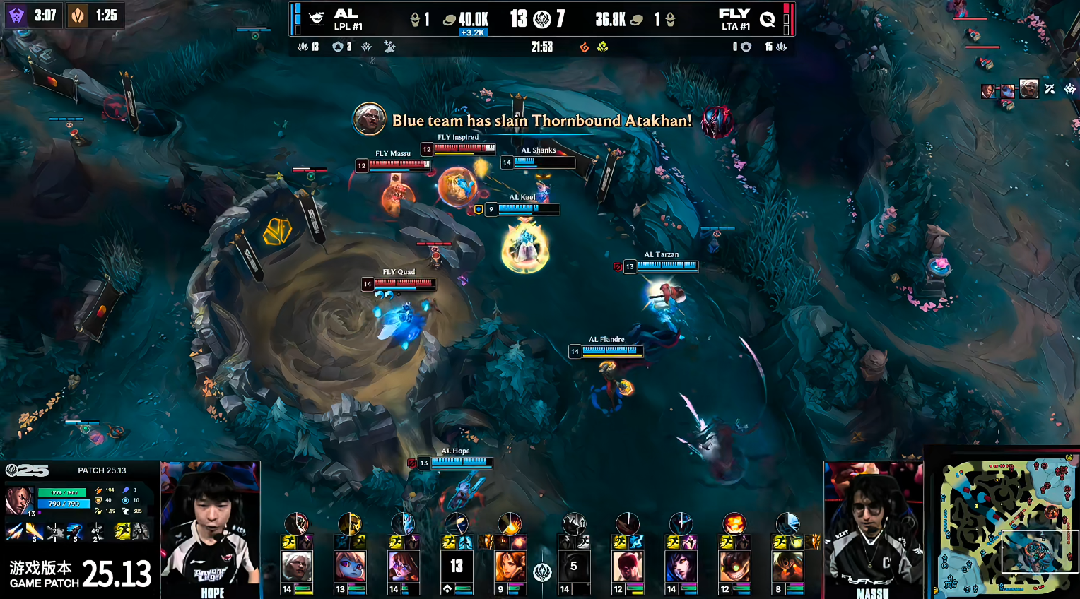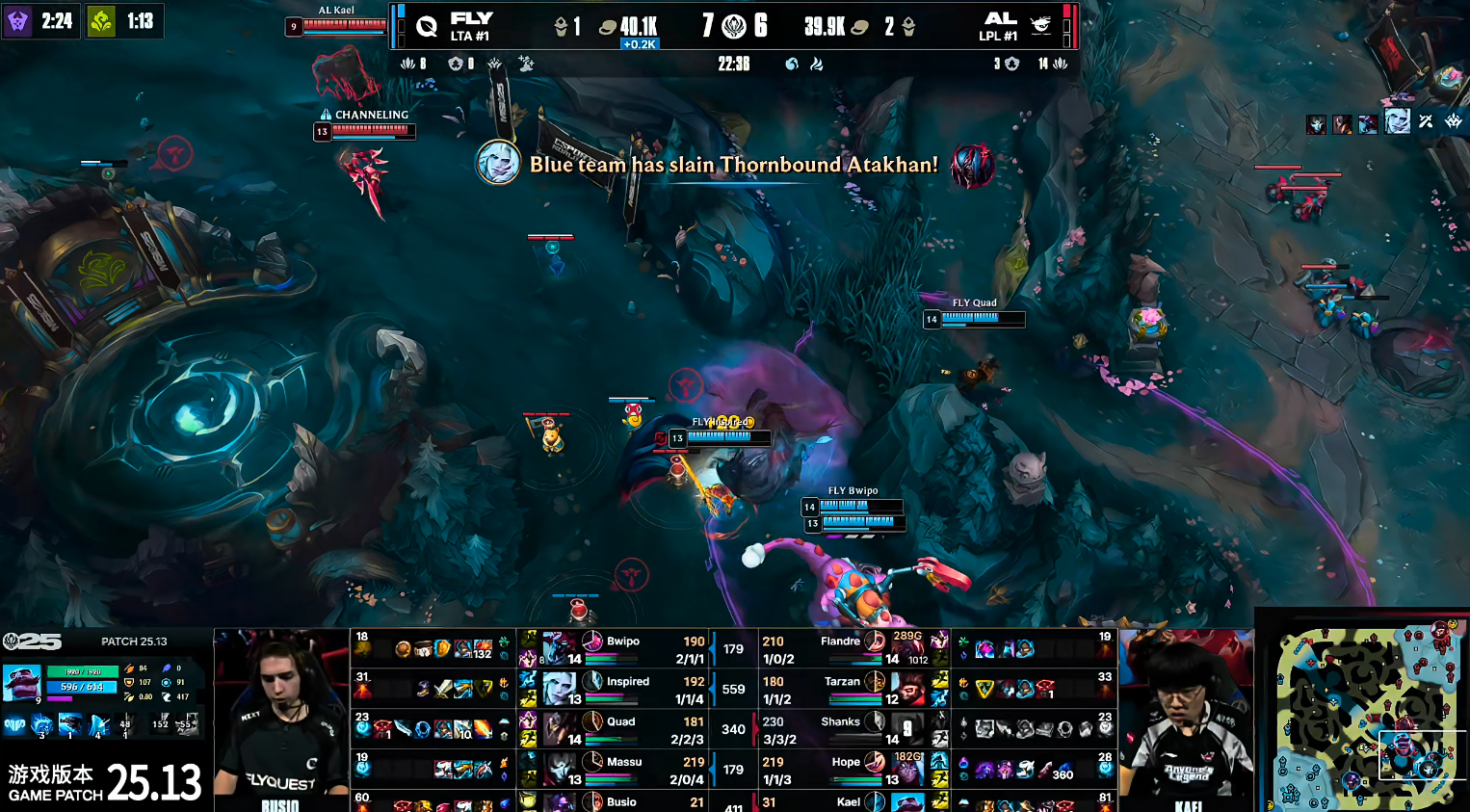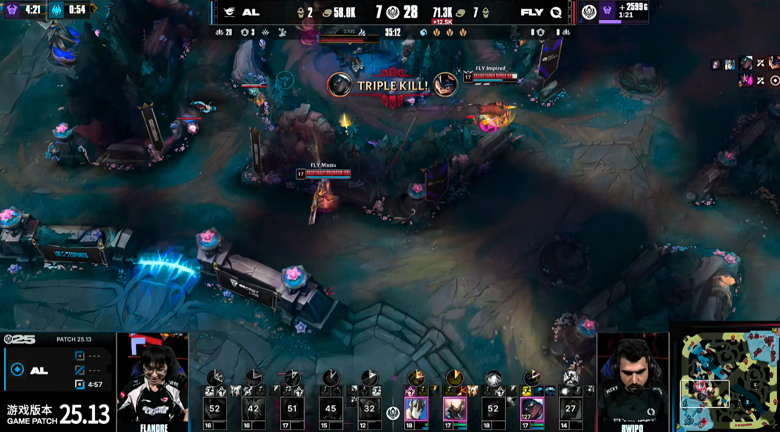 中期FLY通过中路持续施压拉扯,迫使AL难以主动找机会。21分钟,Shanks岩雀两台成功秒杀FLY塞纳,帮助AL短暂缓解压力并拔掉中一塔。但仅两分钟后,FLY在河道团战中打出0换5的完美团战,再度掌控局势,并顺利控下听牌龙。