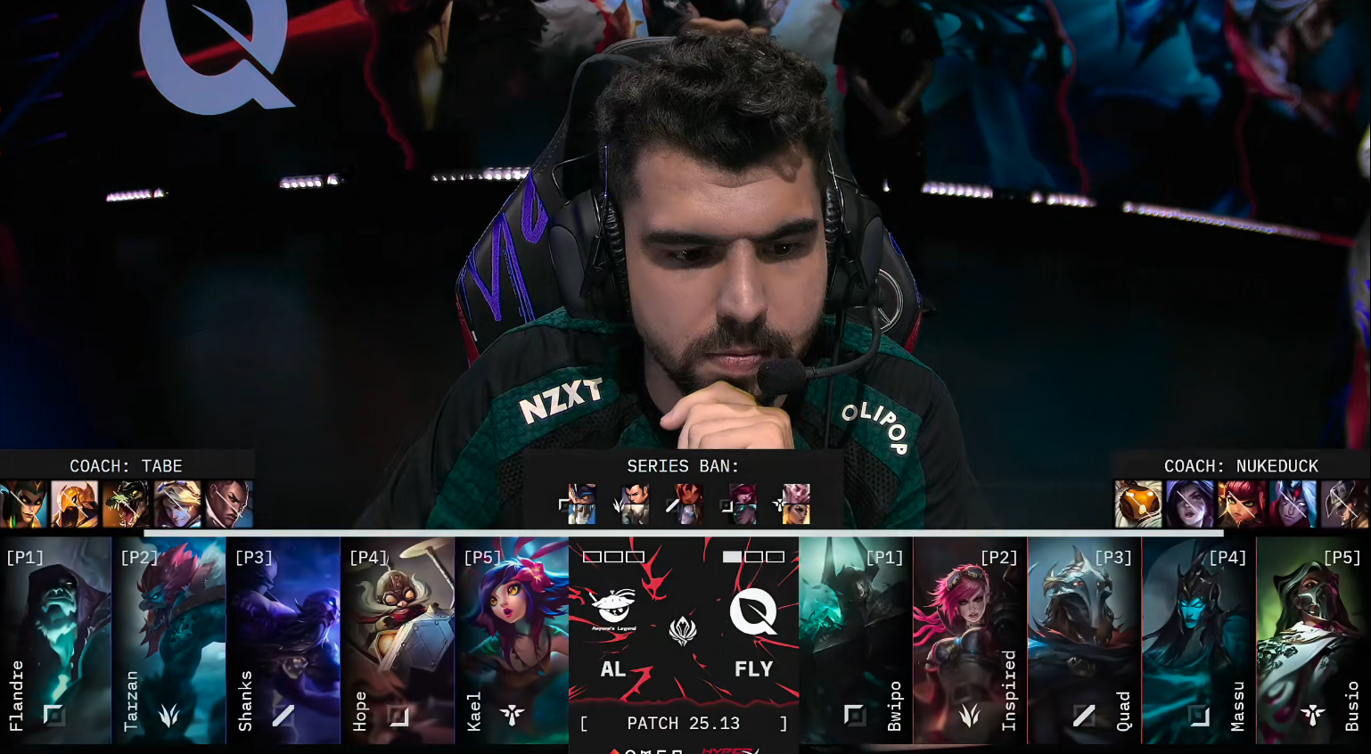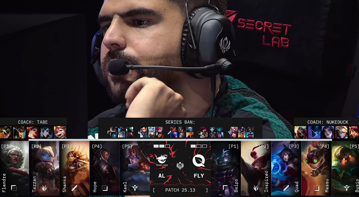 比赛开局AL节奏尚可,开局在野区抓杀Bwipo,并于6分钟控下第一条小龙。然而上路节奏迅速被FLY掌控,圣枪哥的兰博被对手下野辅联动越塔击杀。尽管8分钟AL通过Tarzan反击击杀潘森并顺利控下巢虫,但FLY随即反打,在9分钟中野配合击杀Tarzan稳住局势。