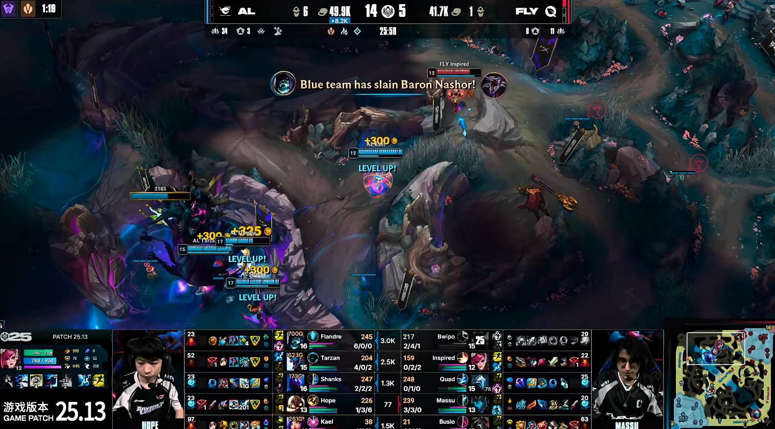 24分钟小龙团战,AL集火击溃FLY野辅组合,再度打出0换3,顺势控下听牌小龙,随后又收入大龙,建立巨大经济优势。