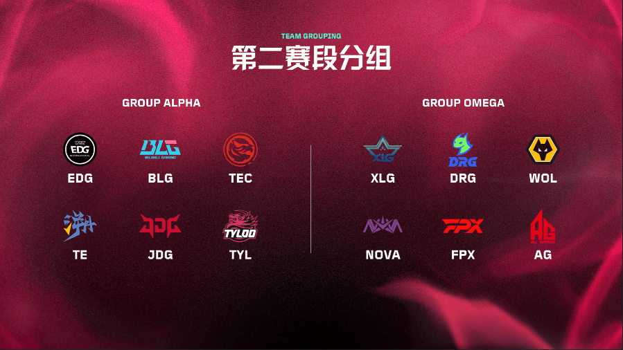 十二支VCT CN联赛队伍根据启点赛排名被分为ALPHA、OMEGA两个组。其中EDG、BLG、TEC、TE、JDG、TYL六支队伍分入ALPHA组,XLG、DRG、WOL、NOVA、FPX、AG分入OMEGA组。