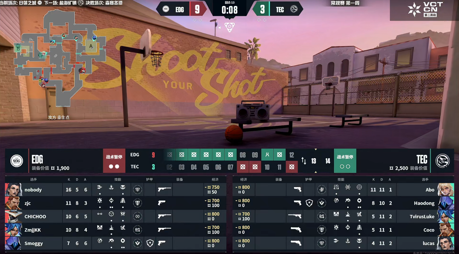 下半场TEC赢下手枪局,第16回合EDG控中不成,随后然后转A,被TEC阅读到在A点入口打掉。第18回合EDG通过一边的施压拉扯打出人数差,直接攻击TEC的薄弱测,EDG拿下下半场第2分。下半场TEC防守追回六分,第21回合球球以一己之力摧毁TEC的回防,球球的一波四杀拿下赛点。第22回合EDG中路夹B一波提速进点成功赢下,EDG 13-9赢下日落之城。