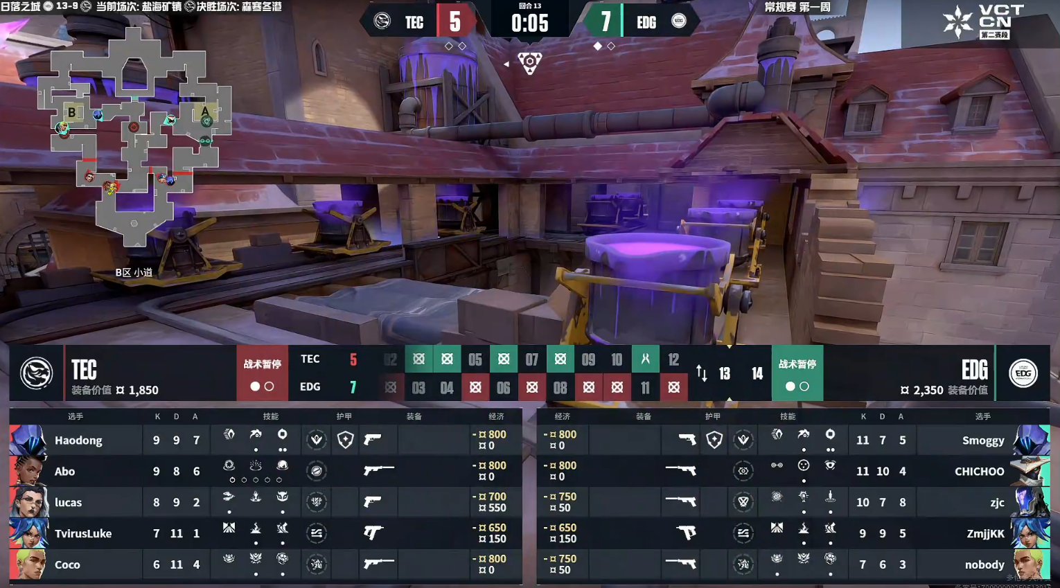 上半场伴随着nobody鬼魅四杀,EDG赢下手枪局。第3回合TEC奖励分快攻A点,zjc与nobody两人防守直架拿下,zjc在包点拿到三杀。第4回合A点的攻防博弈,球球残局打赢拿下三杀,EDG防守打出七连胜。TEC上半场将两个暂停全部使用,第8回合TEC的ECO局快攻A点,EDG前后包夹式回防,对枪没能打过,被TEC赢下首分。第9回合haodong在B点残局守包打掉球球,再度赢下第二分。第10回合TEC来回转点被EDG给“抽奖逮捕”。上半场EDG 9-3 TEC。