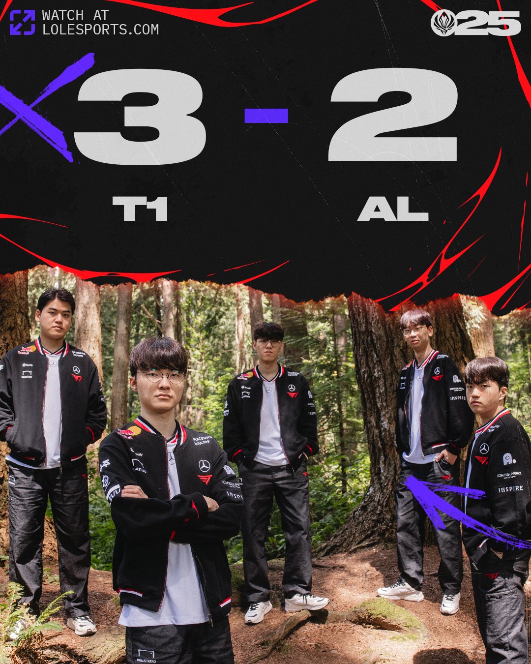 进入中后期,23分钟上路再次团战,Hope卡莎持续发力斩获双杀,AL再度打赢团战并顺利控下听牌龙,优势进一步扩大。25分钟,T1试图通过大龙逼团打架,五人All-in Hope,但Hope卡莎反手飞大脱困,AL反打将T1四人击杀,趁势中路一波推进结束比赛。