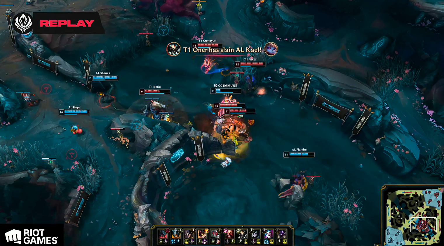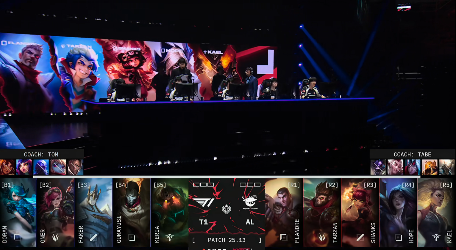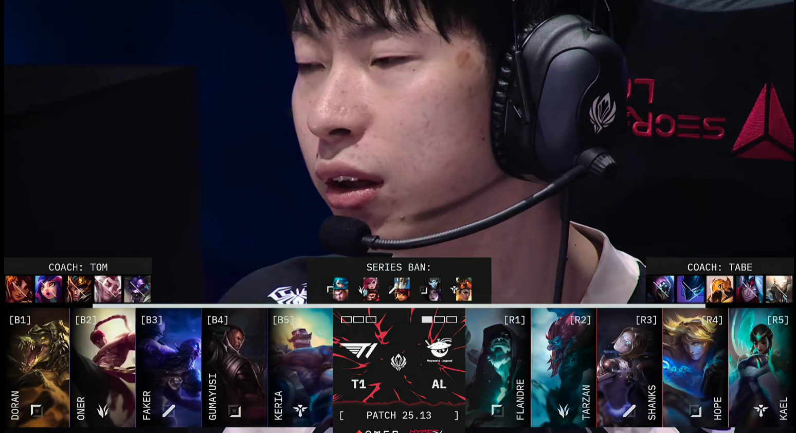 比赛开局,AL上单圣枪哥不幸陷入劣势,连续两次遭到击杀,T1迅速打开上路局势。9分钟巢虫争夺中,T1强势逼退AL,控下全部巢虫资源,Doran的鳄鱼更是持续追击,将AL下路双人组一举击杀,直接将局势推入T1节奏。T1随后顺利控下第一条小龙,并通过越塔击杀Shanks继续滚大雪球。AL开局劣势明显,12分钟虽然Doran略显冒进被圣枪哥收掉人头,但并未改变整体局面。