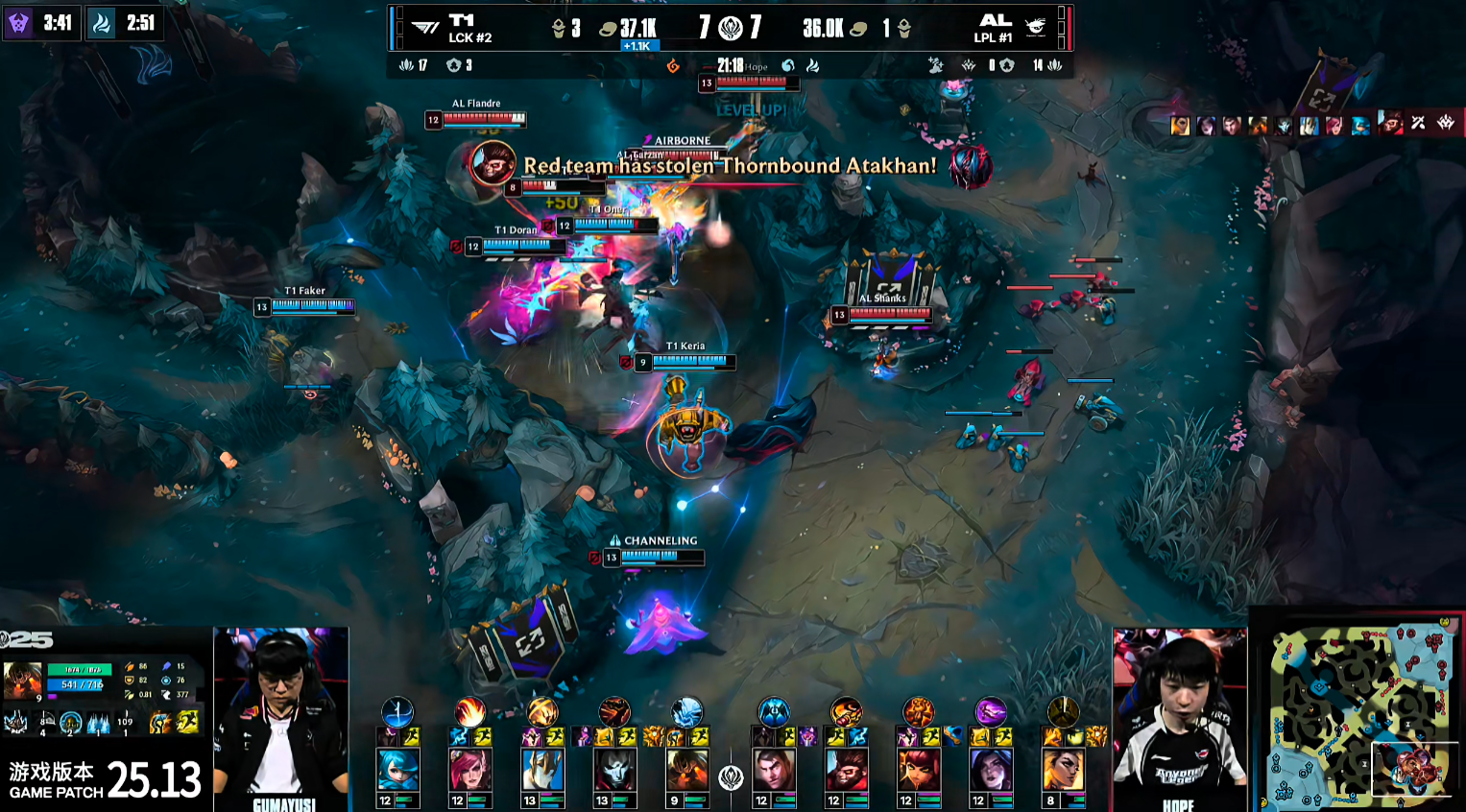 随后AL尝试拿下小龙,但Keria果断进场,用生命完成抢龙。17分钟,AL上路多人包夹击杀Faker的飞机,持续扩大优势。但进入中期,T1逐渐稳住阵脚。19分钟小龙团战中,T1率先开团打残AL多人,成功控下关键听牌龙。23分钟,AL率先动手厄塔汗,却被小吕布霞抢下,团战T1再打出1换2,占据上风。决胜关键点出现在火龙魂团战,T1果断强势接团,Oner的莉莉娅抓住机会大招命中五人,完美控制扭转战局,配合火龙魂的加持,T1瞬间完成团灭并一波结束比赛。