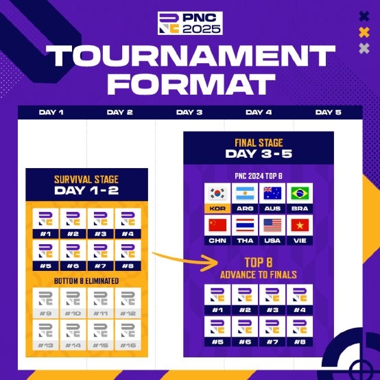 本次PNC 2025 规模更大、更值得期待,参赛队伍从16支扩充至24支。PNC 2024的前8名将直接晋级总决赛阶段,剩下的16支队伍将通过小组赛争夺剩下的晋级名额。