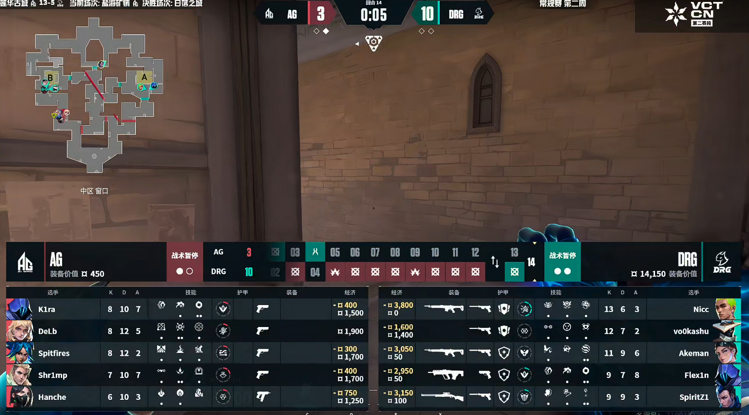 上半场手枪局DRG在B点下包后二打四,vo0kashu守包三杀带队赢下。第2回合AG在A点拖延,C点保着K1ra飞将前压成功打掉DRG完成翻盘。第4回合DRG的双决斗霓虹与夜露的完美配合,直接冲B一波平推了AG在B点的防守。第5回合K1ra雷兹回防C点,极致的控枪瞄准打出ACE。AG打出六连胜,第11回合SpiritZ1夜露开大直接进C拿信息,SpiritZ1混烟打掉三个,DRG这回合提速C点成功拿下。第12回合hanche在C点连接三个,DRG剩下两人无法进点被AG赢下。上半场AG 9-3 DRG。