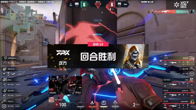 DRG再次赢得手枪局并且顺势收下经济分,随后双方展开了精彩的攻防大战,FPX在长枪局把比分追上,双方咬的很紧。第12回合,FPX利用幻棱大招强行突进A区安放爆能器,奇乐独自摸进中路干扰DRG的回防,帮助FPX成功拿下胜利,双方以6:6的胶着状态结束上半场。