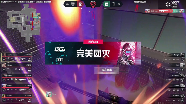 换边以后BLG的气势依然非常充足,连续拿下手枪局和经济局,来到长枪局以后他们依然强势,抓到侧身和架点打掉TE三人,迫使TE选择保枪。在通过最后一个暂停调整以后,Kai扛起责任正义精准连杀帮助TE止住了连败,TE顽强追分完成反超,一鼓作气拿下11分接近了赛点,BLG强攻A区开启蝰腹以后总算是摧毁了TE的防线。第22回合TE凭借冥驹压制住BLG的进攻意图,拖干了时间拿到赛点。BLG吸取教训提速爆弹,顶住压力连拿两分,双方战成12:12,比赛进入加时赛!