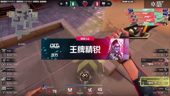 图二上半场的形势与图一几乎一样,但掌握节奏连续得分的一方变成了TE,在打出打比分领先以后BLG果断调整战术,第8回合双方在A区激战剩下2v2的残局,whzy在掩护队友拆包时一波极限的压枪同时打掉上下两个人,加上之前的三杀完成了一波五杀收获王牌精锐!BLG因此士气大振,nephh也贡献了一波精彩的个人表演,BLG连连得手把比分扳平,TE果断交出第一个暂停。暂停结束以后双方又各自拿到一分,最终以6:6平手进入下半场。