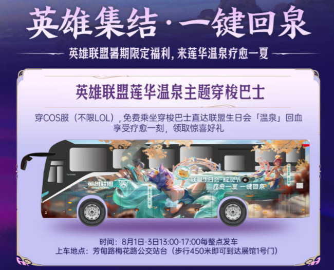 在“联盟生日会·绽灵节”期间,一系列联动活动也已经同步开启,为召唤师们带来了更多的惊喜与福利!以绽灵节为主题打造的大巴,将穿梭于生日会会场和ChinaJoy现场,只要身穿COS服即可免费直达生日会的「温泉」恢复状态。