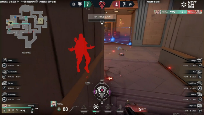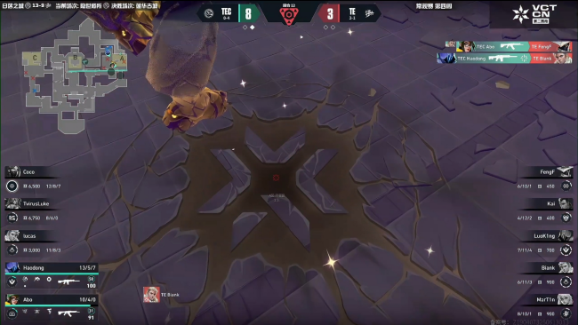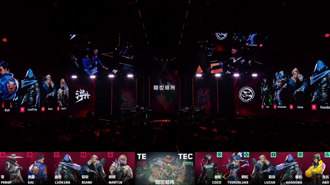 TEC拿到开局两分,TE照常拿下长枪局,但随后被TEC压制,手感出色的TEC队员总能精准接住进场的对手,使得TE对枪压力很大难以成功破点。通过暂停调整状态和战术,TE成功寻找到机会追回两分,但TEC的应对变化也很快,重新把节奏夺了回来,TE的道具难以形成配合只能不断干拉,枪感很好的TEC队员屡屡打出多杀。上半场最后一回合TE投资两个大招依然难以攻入C区只能转点,TEC回防以后高效的补枪配合拿下第9分。