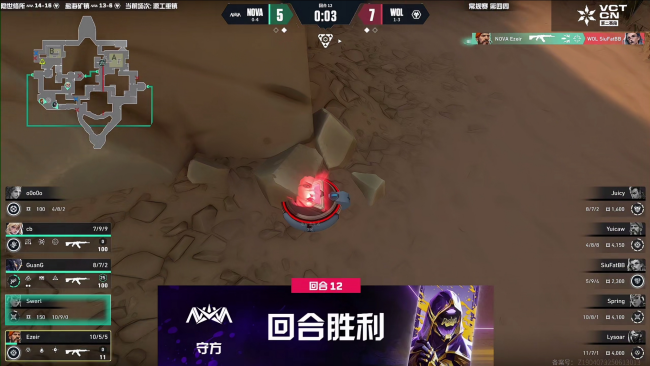 面对WOL针对A区的攻势,NOVA选择主控浴室并且反包A小,凭借这个策略轻松拿下了开局的两分,甚至在第3回合长枪局打出了完美团灭,WOL果断交出暂停,在经济劣势的情况下顶住压力赢下了第4回合,遏制住NOVA的连胜。Swerl想在浴室开大摘取击杀结果被Lysoar瞬秒,WOL成功攻破NOVA的防线,咬住了分差。双方比分战平以后NOVA也拍出暂停,可是WOL已经阅读出NOVA的战术意图,在接下来几个回合里一路连胜,把比赛节奏掌握在了手中。上半场最后一回合,cb在浴室打掉Juicy,WOL的进攻方向转向B区,但NOVA的回防非常果断瞬间反清击溃了WOL,最终把上半场比分定格在5:7。