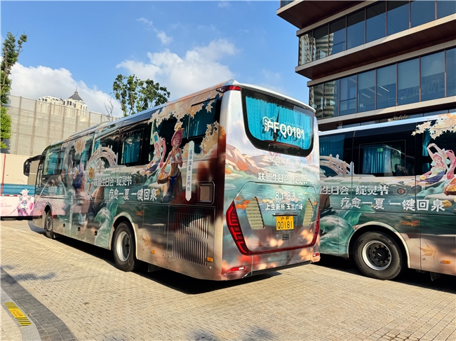 在ChinaJoy的现场,停靠着一辆以“绽灵节”为主题打造的痛车大巴,专门搭载慕名而来的我们直达生日会的“温泉”恢复状态。当大巴行驶在道路上,还有穿着COS服的导游小姐姐提供讲解,与大家分享彼此有关英雄联盟的的点点滴滴。