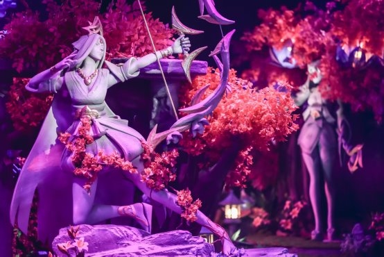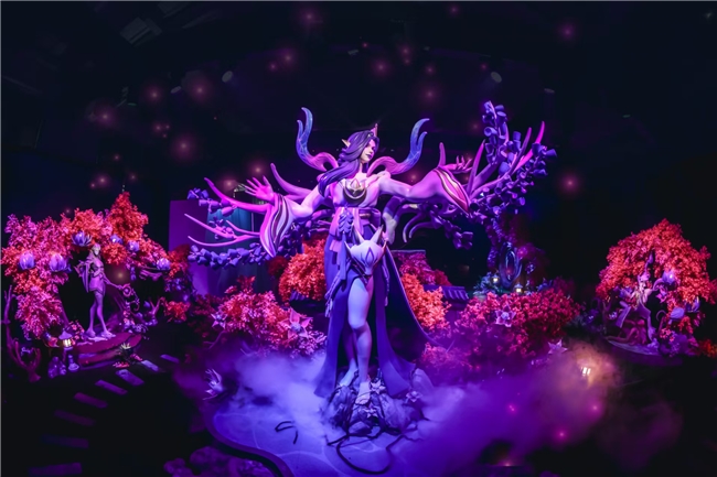 待正式进入生日会的会场,虚拟与现实的壁垒仿佛在那一刻被击碎:一尊巨型的“圣堂 灵魂莲华 莫甘娜”雕像映入眼帘!睥睨众人的莫甘娜,甚至隐隐约约能感受到这位堕落天使的压迫感。