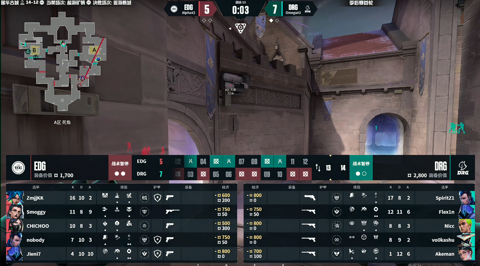 上半场开始,伴随着康康拿到2000杀的成就,EDG率先得分赢下手枪局。EDG开局打出一波四连胜的小高潮,DRG拍出暂停并取得效果,第5回合EDG进攻变速,众人迅速抱团快速摘掉SpiritZ1的冥驹,并进点下包,DRG回防Nicc铁臂开大站住点内,EDG众人被堵在烟外,DRG强拆赢下。DRG找到比赛节奏,开始围绕着SpiritZ1夜露体系打,DRG连追三分。第8回合康康的正义打穿AB连,帮助队伍进入点内,Jieni7与Smoggy两人双拉守包赢下。第10回合Jieni7在A大的一波精准支架四杀拿下。上半场EDG 7-5 DRG,双方战况焦灼,EDG在拿到领先后并没有将分差拉开差距。