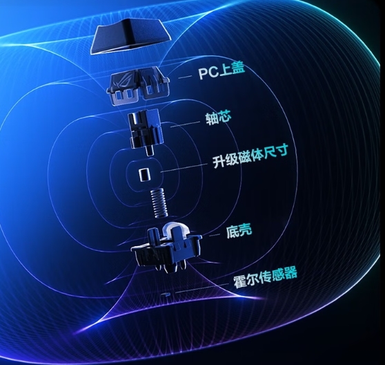 在轴体方面,该键盘采用了ROG HFX V2第二代磁轴,轴芯与底壳均选用POM材质,不仅赋予了键盘坚实有力的敲击手感,更拥有高达1亿次的按键寿命,确保长期使用的稳定性。搭配全新的ROG霍尔传感器,实现了0.01mm的高精度和更大的磁通量,抗磁干扰更强,感应精准迅速,为玩家带来超快响应体验。此外,双侧墙轴芯设计进一步提升了敲击稳定性,同时有效防尘,确保按键始终保持顺滑流畅的操作感受。