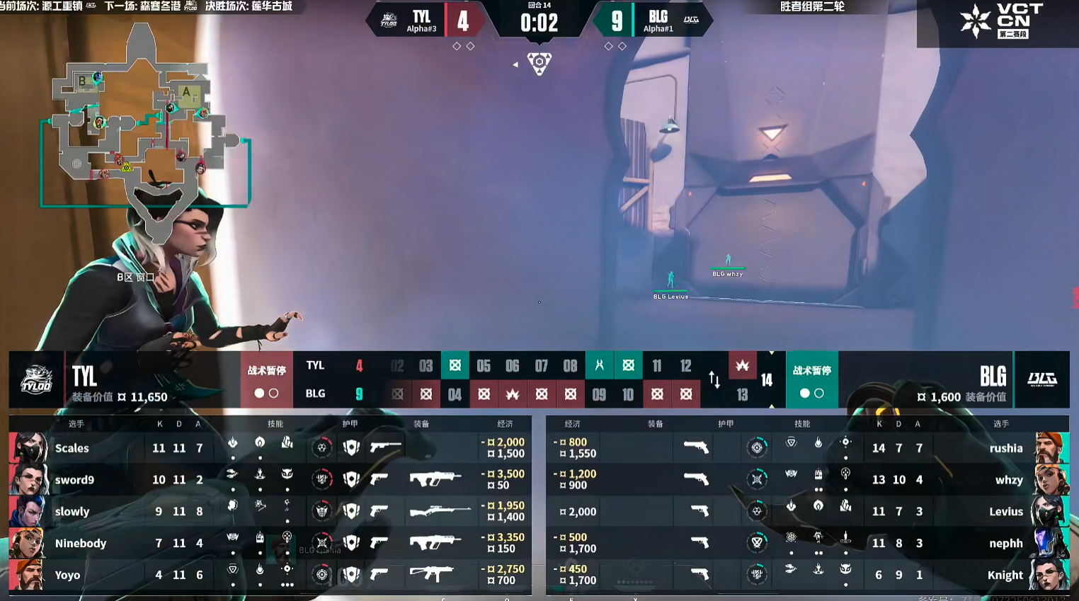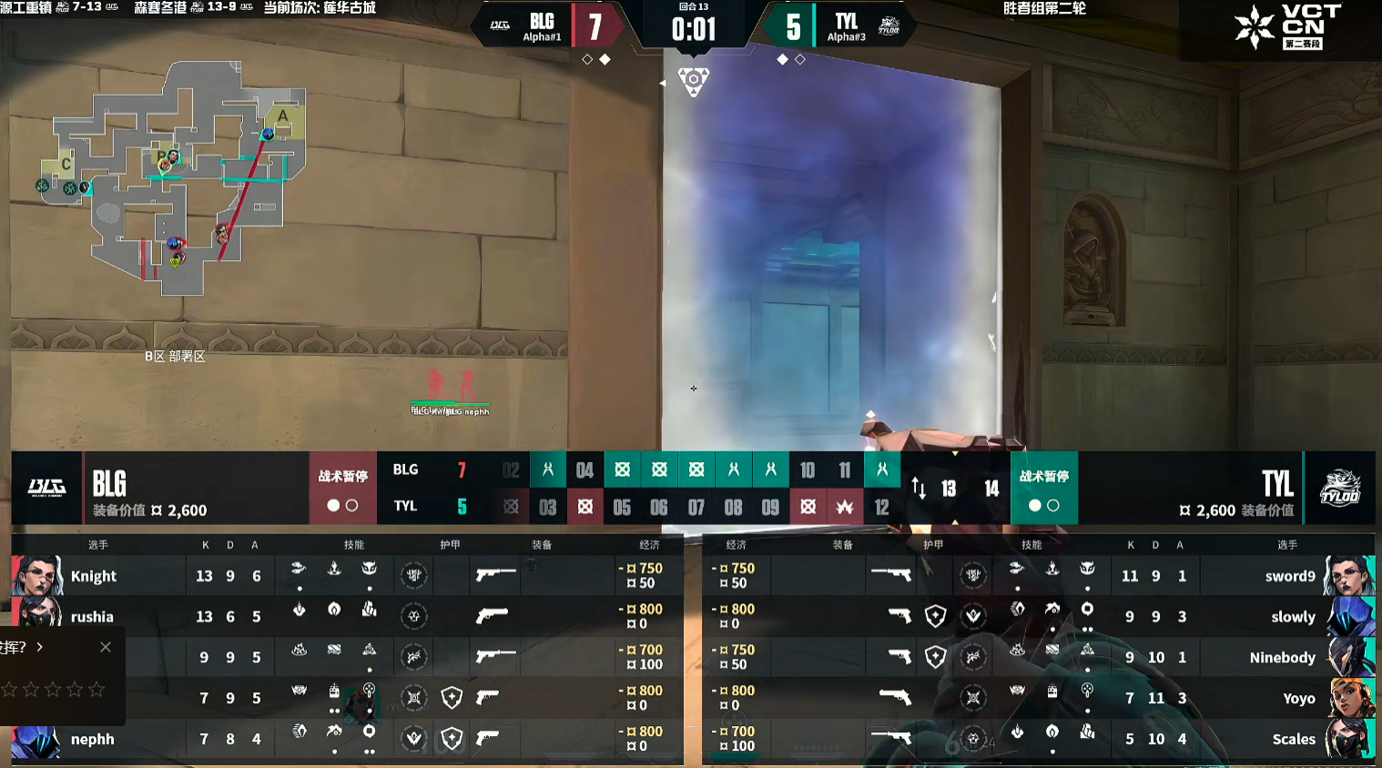 上半场手枪局nephh单人在浴室打掉两人,撕开天禄在A点的防守。第3回合天禄的长枪局被whzy三杀打穿浴室。BLG开局连下三分,第4回合天禄的ECO局,老九在B二楼出正义三杀带队翻盘拿到首分。第6回合天禄强起一把冥驹与狂徒,在回防B点的残局Ninebody没能打赢。BLG打出四连胜,第9回合天禄守住A点,顶住BLG的夹击,天禄追回两分。第11回合BLG在A点打掉天禄两人,带包转B成功赢下。上半场BLG 9-3 TYL。