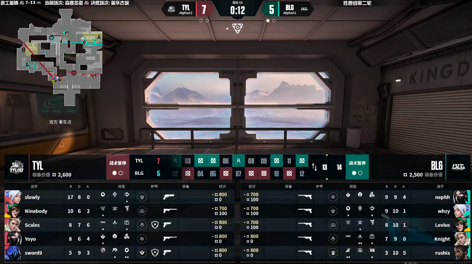 上半场天禄赢下手枪局,随后第2回合小K残局打掉老九成功翻盘。第4回合开始天禄被打掉两人,剩下三人强行打B,老九左右直架在包点顶住BLG的回防。第5回合A点的混战,BLG成功将天禄的进攻时间压榨,最后时刻BLG二打一的成功完成翻盘。BLG打出五连胜,第10回合天禄直接提A打掉rushia下包,BLG回防双方点内交手,slowly残局打掉小K赢下。天禄追回两分没能赢下上半场最后一回合,最终上半场BLG 7-5 TYL。