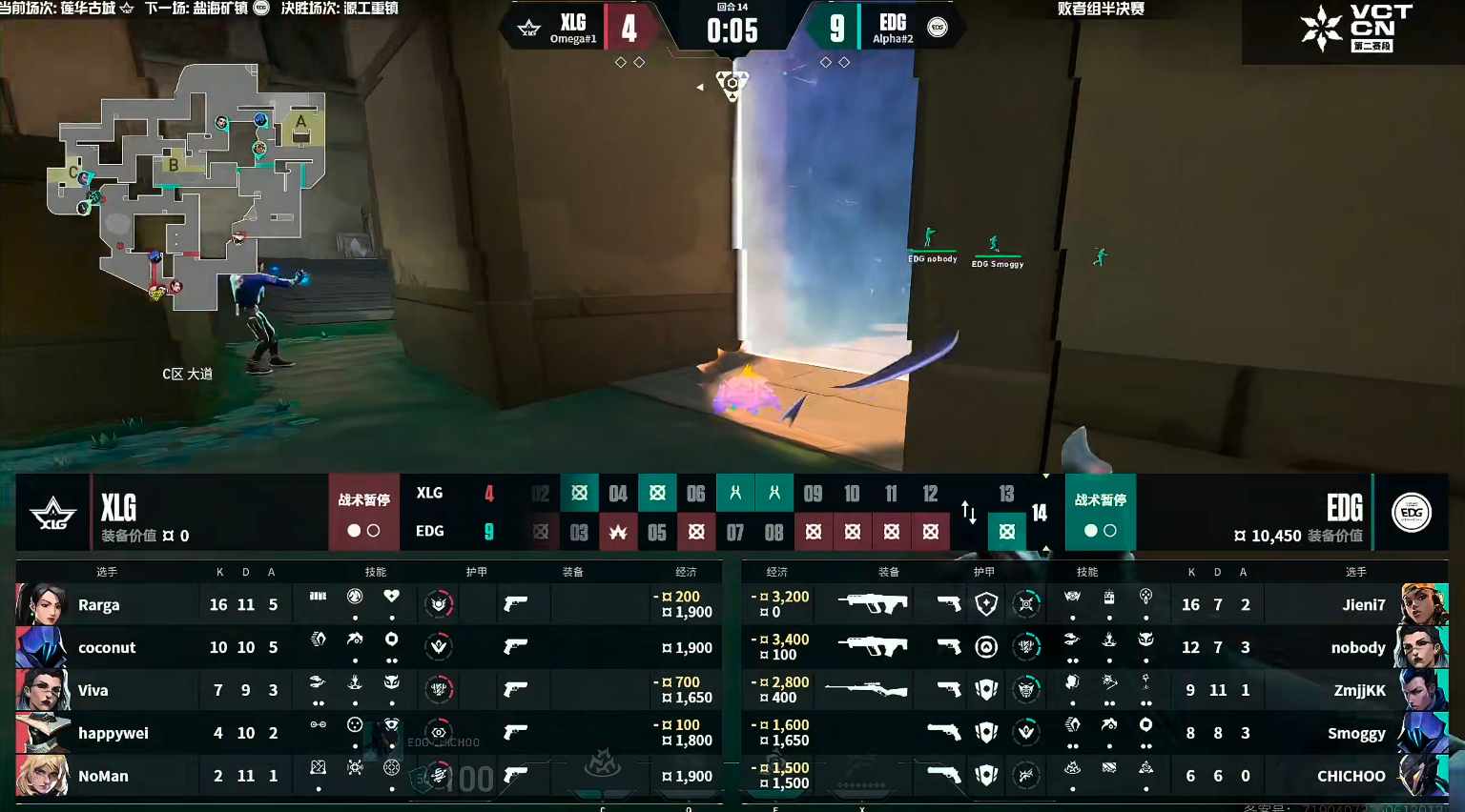下半场nobody与Jieni7带队赢下手枪局,第16回合nobody与Smoggy两人在A点守住XLG的进攻赢下。EDG下半场打出四连胜拿到赛点,XLG三哨进点技能协同会瞬间将点内的人全部逼退,XLG追回七个赛点,第24回合XLG打A,被球球维斯开大缴掉武器并打掉两人,EDG将XLG三人堵在树屋,XLG进退两难最终艰难进B下包后被打掉,EDG 13-11赢下莲华古城的胜利。