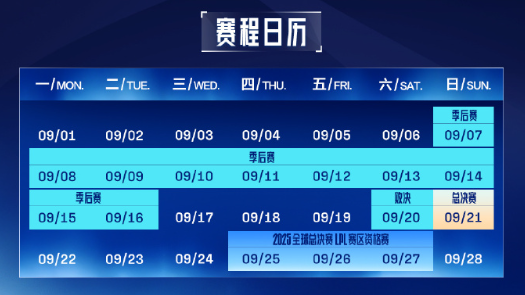 LPL第三赛段季后赛将在9月7日于深圳NIP主场正式开始。9月20日进行败者组决赛,9月21日进行总决赛。冒泡赛将在9月25日-9月27日。