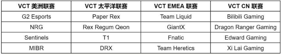 VCT CN 联赛、VCT 美洲联赛、VCT EMEA 联赛和 VCT 太平洋联赛到全球赛事,最出色的十六支队伍晋级无畏契约冠军巡回赛的最终赛场其中: