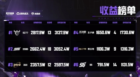 和冠军相比,亚军和季军的夺奖之路同样不容易。9986战队在决赛上半场仅有20万收益的情况下,下半场奋起直追,扫下大半个辐射区物资的情况下还开出一张幸运黑卡,全队发挥默契拿下12个淘汰,最终从榜末逆袭获得亚军;359战队小组赛以第一名杀出重围,半决赛上半场位列倒一且收益差极大,下半场逆天改命团灭三队成功晋级,并在总决赛中稳扎稳打顺利拿下季军。