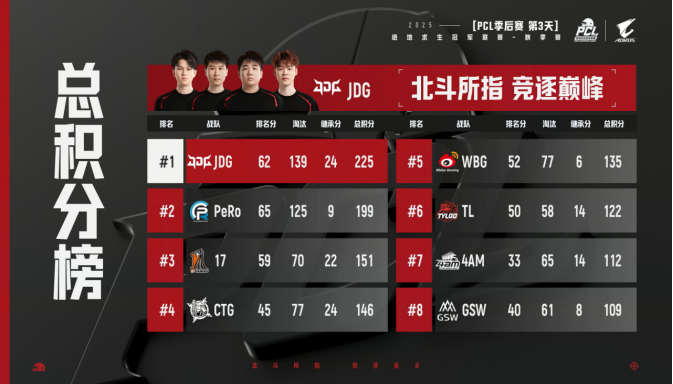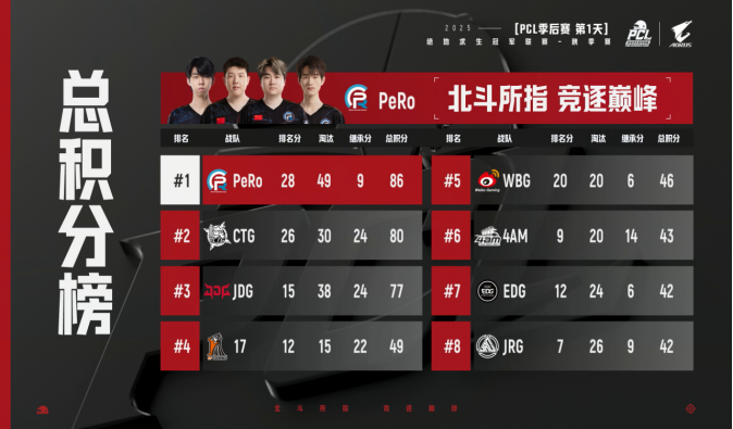 第二天比赛过后,PeRo战队继续领先,JDG和17战队紧随其后。