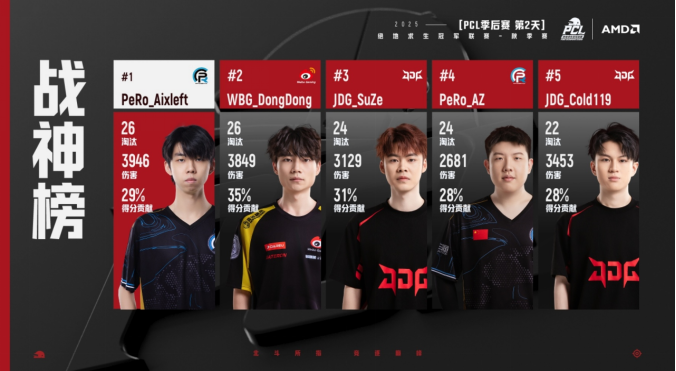 而最后凭借着多场的吃鸡,以及积少成多的得分点,JDG成功拿下了本次PCL2025秋季赛季后赛的总冠军!而PeRo则是以400的高分拿到了PGC积分的榜首。