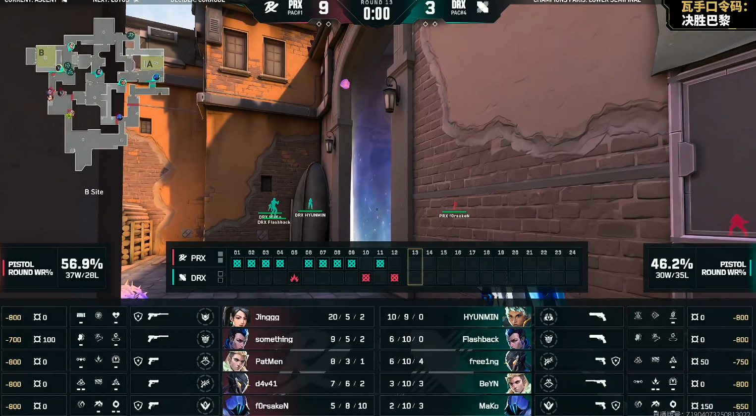 下半场DRX赢下手枪分,HYUNMIN第14回合戍卫连点四个,第15回合PRX用三把长枪的代价打B赢下。DRX打出五连胜将比分打平。第21回合PRX孤注一掷交出三个大招打B赢下。PRX连下两分拿到赛点,第23回合DRX架住中路过点,将PRX的进攻全部打掉,DRX连下两分将比赛打到加时。加时赛打到第二轮,DRX进攻边,A大对枪打赢进A直接赢下。换边之后DRX快速回防根本不给PRX任何机会,DRX 15-13赢下图一。