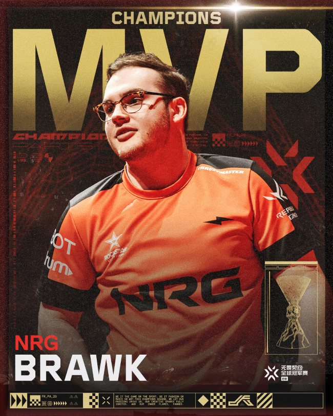 最终,NRG以3-2战胜FNC夺得2025无畏契约巴黎全球冠军赛总冠军,NRG队内选手”奥丁王”brawk凭借亮眼的表现获得总决赛MVP。
