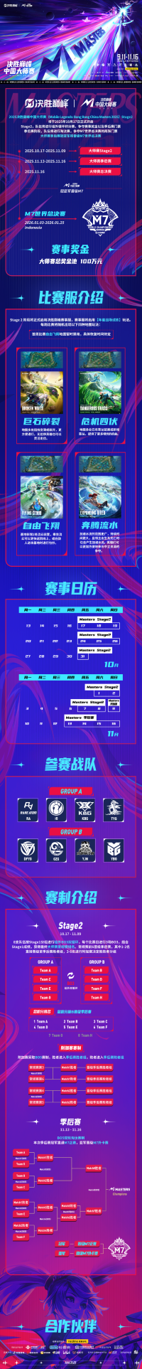Stage2将持续至11月9日。随后,11月13日至16日将进行大师赛季后赛,11月16日迎来大师赛总决赛。大师赛总奖金池达100万元,同时,大师赛季后赛的冠亚军将晋级2026年1月3日-25日在印度尼西亚举办的M7世界总决赛。
