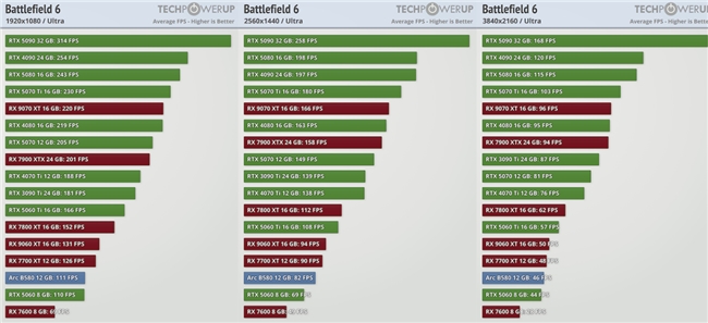 根据实测不难发现,《战地6》对显卡的要求不高,RTX 5060即可在1080P下60FPS稳定运行;而2K选择RTX 5070还能保持144Hz的电竞高刷需求,4K亦可保持流畅;4K极限画质下则建议选择RTX 5080更具有性价比。