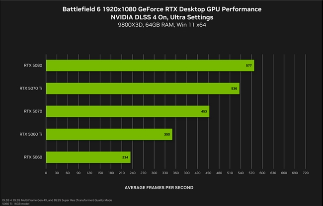 值得一提的是,以上三款显卡均支持最新的NVIDIA DLSS 4技术,可以应用在包括《战地6》在内的数百款游戏内,在游戏中开启DLSS 4后,帧率可提升至原来的 3.8 倍,同时还支持NVIDIA Reflex技术,该技术可以显著改善显卡与键盘鼠标之间的操作延迟,让你在电竞对抗中更加灵敏和自如。