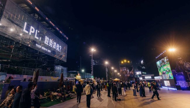 整个观赛派对的核心,是一条结合了观赛、互动与情怀的沿江长廊。现场不仅设置了从1550段到2000段多个阶梯式观赛区,更巧妙地将LPL的传奇记忆融入了风景里。百米超长的沿江线化身为一条“赛事记忆走廊”,过往赛事的经典画面与高光时刻被一一呈现,让玩家在移步换景中重温激情。