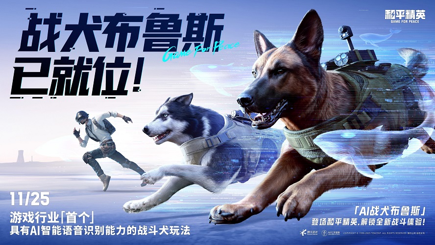 11月25日,《和平精英》将在游戏内正式启动AI全新产品的测试打磨,推出游戏行业首个具备AI智能语音识别能力的AI战犬玩法——“战犬-布鲁斯”,也是游戏行业首个支持实时语音识别的AI战斗犬游戏伙伴。